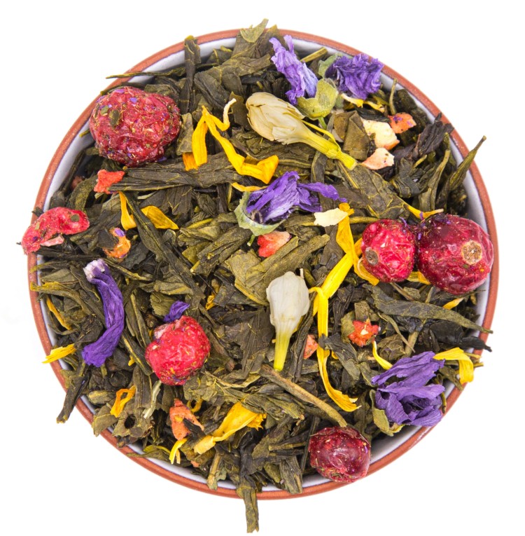 Купаж зеленого китайского чая сенча с кусочками клубники, ягодами красной смородины, бутонами жасмина, цветами мальвы и лепестками календулы. Имеет аромат сочной клубники и цветочный шлейф. Приятная сладость во вкусе понравится как взрослым, так и детям.